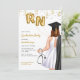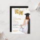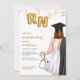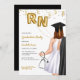Invitación a la fiesta de graduación de la escuela de Enfermería de retrato. Curvy Invitación femenina de enfermería para su hija, sobrina, madre, tía, primo o amiga que se está graduando de la escuela de enfermería y ahora es oficialmente enfermera. Invitación a graduadas de la Escuela de Enfermería para fiestas de grado que celebran a mujeres que acaban de graduarse de la escuela de enfermería. ¡Celebra la nueva enfermera registrada con esta elegante invitación a graduarse de enfermería! Con retrato de una piel clara, más mujer de tamaño con el pelo castaño largo del hombro. El graduado de enfermería lleva un elegante vestido blanco, una bata negra de graduación sobre su hombro y una gorra negra de graduación a juego. Lleva globos de Relieve metalizado dorado con las letras RN en una mano y un estetoscopio en la otra. Acentuada con un confetti dorado brillante, captura perfectamente la alegría y la emoción de su gran logro.