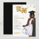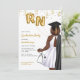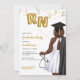 Invitación a la fiesta de graduación de la escuela de Enfermería de retrato. Invitación a enfermeras afroamericanas para su hija, sobrina, madre, tía, prima o amiga que se está graduando de la escuela de enfermería y ahora es oficialmente enfermera. Invitación a graduadas de la Escuela de Enfermería para fiestas de grado que celebran a mujeres que acaban de graduarse de la escuela de enfermería. ¡Celebra la nueva enfermera registrada con esta elegante invitación a graduarse de enfermería! Con retrato de piel oscura, más mujer de tamaño con cabello marrón ondulado. El graduado de enfermería lleva un elegante vestido blanco, una bata negra de graduación sobre su hombro y una gorra negra de graduación a juego. Lleva globos de Relieve metalizado dorado con las letras RN en una mano y un estetoscopio en la otra. Acentuada con un confetti dorado brillante, captura perfectamente la alegría y la emoción de su gran logro.