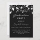 Una glamorosa invitación para una fiesta de graduación de 20xx (cualquier año) tanto para él como para ella. Un fondo negro decorado con estrellas blancas. Personalice y agregue un nombre y detalles del fiesta. El texto Graduación y el nombre están escritos con escritura de estilo con letras a mano moderna. Texto de color blanco.