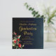 Delicada, sofisticada y llena de elegantes invitaciones a la fiesta de graduación con un simple pero hermoso detalle floral en la esquina inferior izquierda con hermosas flores rojas y doradas, complementadas con exquisitos botánicos verdes. Tipografía elegante de personalizable dorado para los detalles de la invitación a la fiesta de graduación sobre un gradiente azul de medianoche para el fondo. El reverso de la invitación presenta un arreglo floral más simple pero igualmente encantador con un monograma de caligrafía de escritura.