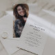 Esta invitación a una fiesta de graduación fotográfica con tipografía de moda es perfecta para un fiesta moderno al aire libre. El diseño es sencillo y presenta una tipografía minimalista clásica en blanco y negro con un toque rústico de boho. Personalizable de cualquier color. Mantenga el diseño minimalista y elegante, tal como está, o lo personalice añadiendo sus propios gráficos y obras de arte. Combine su invitación de gradación y la invitación de fiesta con esta tarjeta delantera y trasera.