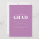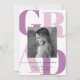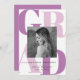 Invite a los invitados a celebrar el grado con nuestras letras negrita invitaciones a la fiesta de graduación! La moderna fiesta de graduación invita a presentar la foto del graduado en el medio rodeada de "Grad" en negrita con letras violetas. Personalice el frente agregando el nombre del graduado, el año escolar y el año de graduación. La parte posterior de la invitación dispone de espacio para los detalles de su fiesta en blanco con un fondo morado.