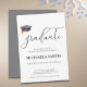 Invitación moderna y simple a graduarse con el ilustracion de un gorro negro de graduación y una tipografía elegante. Ilustrado y diseñado por Patricia Álvarez.