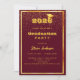 Una invitación moderna y de diseño para una fiesta de graduación. Tanto para él como para ella. Borgoña de fondo, texto dorado, confeti y un marco. Una gorra de graduación dorada.