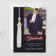 Invitación a una fiesta de graduación de personalizados rojos y negros. Añade la fecha, el nombre del graduado y la foto al frente de esta tarjeta de graduación, y personaliza la información de la parte posterior. Tarjeta diseñada por Rycky Creations; pintura original de tassel blanco ©delicia-doodles. Contacte con un artista para una tarjeta con sus propios colores escolares!
