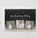 Elegante diseño de invitación a fiesta de graduación personalizado con confeti de oro y plata sobre fondo negro, tipografía moderna de escritura con las palabras "Partido de Graduación", el nombre del graduado (en plata) y tres de tus fotos favoritas enmarcadas en Relieve metalizado metálico de plata. Personalízalo con los detalles de su fiesta en el reverso de la invitación.