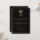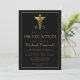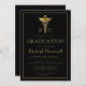 Este clásico y elegante diseño de fiesta de graduación presenta un caduceus dorado flanqueado por dos letras editables (por ejemplo, RN para Enfermera Registrada) sobre un fondo negro. Personalice el texto con el nombre del graduado, la escuela y el año, junto con los detalles del fiesta. Un delgado borde rectangular de color dorado rodea el diseño. El dorso de la tarjeta es negro sólido,