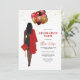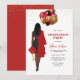 Invitación a la fiesta de graduación de una mujer afroamericana. Partido de Graduación Invitación retrato femenino dibujando vestido negro, gorra roja y vestido, pelo largo oscuro. Diseño de globo de Relieve metalizado falso.