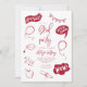 Funky tarjeta de invitación de fiesta de graduación con ilustracion a mano de graduación e íconos relacionados con la escuela en rojo.