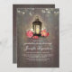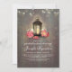 Invitación a la fiesta de graduación de madera de granero rústico antiguo con una lámpara metalizado vintage con velas, flores rosas y blancas, y alambre romántico con luces de cuerda