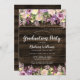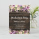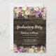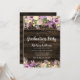 Esta morada invitación a una fiesta de graduación floral es perfecta para una celebración con temática de país. Este diseño único incluye flores de color morado de lavanda, luces de cuerda y un fondo de madera oscura de granero. Personalice fácilmente esta invitación con los campos de plantilla en línea.