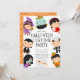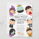 Esta espeluznante y divertida invitación incluye a una bruja, Drácula, un diablo, mamá, Frankenstein, esqueleto y un chico de calabaza. Las palabras "Fiesta de disfraces de Halloween" están escritas en un tipo de letra divertido y festivo. Es la manera perfecta de invitar a los amigos de sus hijos a una fiesta de Halloween espeluznante y dulce donde pueden venir vestidos como sus monstruos favoritos.
