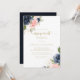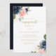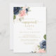 Esta invitación a la fiesta de compromiso con el oro florido de la marina es perfecta para un evento rústico. El diseño está decorado con bonitos azules, azules, navales, rosas, ruidosas, doradas y verdes paisajes.