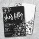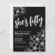 Floral Cincuenta blancos negros invitaciones a la fiesta de cumpleaños número 50. Una divertida pero elegante invitación a la fiesta de cumpleaños número 50 con flores blancas y negras para los jóvenes en el corazón. Un patrón de flores juguetón enmarca una tipografía de escritura "ella tiene cincuenta" mezclada con un tipo de letra serif más clásico. Celebra cincuenta años de vida con este hermoso diseño botánico. La parte divertida es que puedes cambiar TODOS los colores. No sólo se pueden cambiar los colores de fondo y el tipo de letra, sino que también se pueden cambiar las líneas de las flores. Disponible en forma de invitación impresa, o como una invitación digital descargable que puede enviar por correo electrónico o que ha impreso localmente.