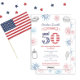 Un diseño informal de invitación a los blancos y azules rojos a los 50 años para una comida familiar al aire libre o un fiesta de picnic