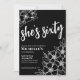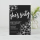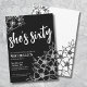 Elegante 60 años de la fiesta de cumpleaños de los blancos negros. Una divertida pero elegante invitación a la fiesta de cumpleaños número 60 con flores negras y blancas para los jóvenes en el corazón. Un patrón de flores juguetón enmarca una tipografía de escritura "ella tiene sesenta" mezclada con un tipo de letra serif más clásico. Celebra sesenta años de vida con este hermoso diseño botánico. La parte divertida es que puedes cambiar TODOS los colores. No sólo se pueden cambiar los colores de fondo y el tipo de letra, sino que también se pueden cambiar las líneas de las flores. Disponible en forma de invitación impresa, o como una invitación digital descargable que puede enviar por correo electrónico o que ha impreso localmente.