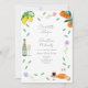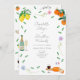 Hermoso y caprichoso queso francés y decoración de boda colorida moderna y colorida, invitación al encuentro con botánicos, naranja y cítricos limoneros, ideal para una soleada fiesta de compromiso boda con la temática europea. Las obras originales de la artista Catherine Sweetman incluyen follaje, flores silvestres, queso y vino franceses, la bandera francesa, notas musicales y flautas de vino espumoso. Escritura a mano caprichosa y escritura tipográfica moderna con plantillas fáciles de personalizar para añadir nombres, la fecha y otra información esencial junto con las iniciales de novia y novio en el ilustracion de la etiqueta de botella de vino espumoso. La paleta de colores incluye limón, amarillo, naranja, verde, azul, violeta y rosa.