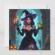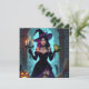 Invitaciones de la fiesta de Halloween con arte de Aai que representa a una bruja hermosa en negro y violeta sosteniendo una candelabra y una rana, con un gato negro, un gato o una linterna parado en la puerta de una mansión embrujada que invita a los huéspedes a entrar.