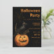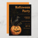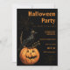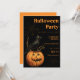 Invitación moderna a la fiesta de Halloween con telarañas en las esquinas del diseño con la "fiesta de Halloween" mostrada en una tipografía de letras naranjas con un extraño pájaro negro y Jack Lantern sobre un fondo blanco y negro. Personalice la invitación de la fiesta de Halloween negro y naranja con los detalles de su fiesta.