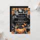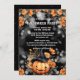 Hermosa invitación a la fiesta de Halloween con una linterna vestida con un gorra negro de brujas y rodeada de flores naranjas.