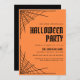Invitación moderna a la fiesta de Halloween con telarañas en las esquinas del diseño con la "fiesta de Halloween" mostrada en una tipografía de letra negra con antecedentes naranjas. Personalice la invitación de la fiesta de Halloween negro y naranja con los detalles de su fiesta.