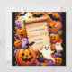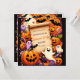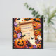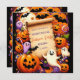 El diseño presenta un pergamino antiguo en el centro, lo que proporciona un espacio en blanco para el texto. Alrededor del pergamino se encuentran varios íconos con temática de Halloween, incluyendo farolillos sonrientes de jack-o’, fantasmas con diferentes expresiones, maíz dulce, copas de color de Halloween, arañas negras y murciélagos. El fondo es un violeta profundo con estampados estelares sutiles, creando un ambiente lúgubre y espeluznante perfecto para una invitación a Halloween.