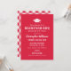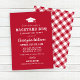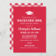 La invitación a la fiesta "Backyard BBQ" incluye un motivo de cierre de graduación, un elegante texto personalizado con fuentes rústicas y modernas, un desplazamiento y elementos de diseño de patrones de manto y texto blanco. Se puede personalizar el fondo rojo y el patrón de manteles de gingham en la parte posterior de la tarjeta. Perfecto para una fiesta de graduación al aire libre.