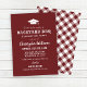 La invitación a la fiesta "Backyard BBQ" incluye un motivo de cierre de graduación, un elegante texto personalizado con fuentes rústicas y modernas, un desplazamiento y elementos de diseño de patrones de manto y texto blanco. Se puede personalizar el fondo rojizo marrón y el patrón de manteles de gingham en la parte posterior de la tarjeta. Perfecto para una fiesta de graduación al aire libre.