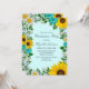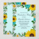 Invitación rústica para graduarse con girasoles vibrantes, daises blancos tradicionales y flores verde azuladas contra un fondo acuático claro con el aliento del bebé y acentos de vegetación botánica