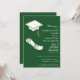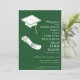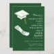 Esta simple invitación para graduación incluye un gorra de graduado y ilustraciones de diploma y una plantilla para personalizar la invitación con el nombre del graduado, año, nombre de la escuela, fecha, lugar y datos de RSVP. Este diseño está decorado en tonos verdes y blancos.