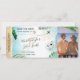 Pase de embarque de billete de boda en la playa de destino dorado con avión y corazón y avión con hojas tropicales. Puedes añadir tu foto