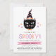 Esta súper adorable invitación a la fiesta de cumpleaños incluye un gato negro dibujado a mano, con un gorra de brujas y corbata de arco. Además del negro, otros colores son el violeta pastel, el rosa y el melocotón. El texto dice: "¡Es hora de conseguir SPOOKY!" en un tipo de letra moderno y multicolor. La parte posterior de la tarjeta contiene estrellas rosas, violetas y melocotones sobre un fondo negro. *Obra de arte de Orabella Prints
