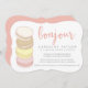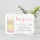 ¡Oh la la! Estas tarjetas de invitación pastel superfemeninas son perfectas para una fiesta de cumpleaños de 16 años con temática francesa o parisina. Las tarjetas de forma única cuentan con una pila de deliciosas galletas de macarón en tonos pastel de rosa, amarillo, marfil y marrón, con "Bonjour" en la parte superior en un guion de estilo manuscrito color rosado. La tarjeta se revierte a rosa de color sólido.