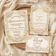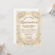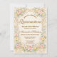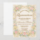 A romantic pastel composition framed with ornate champagne scrollwork and blooming blush, peach, ivory, and soft blue florals. The graceful baroque silhouette creates a timeless European-inspired border, while the warm parchment background keeps the design light and luminous. Balanced symmetry and delicate botanical detailing give this piece an heirloom-quality elegance. Perfect for a quinceañera celebration filled with softness, tradition, and refined beauty.