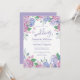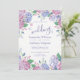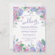 Invitación a la Boda Floral Pastel Hydrangeas, diseñada en tonos suaves morados, azules y rosas, sobre un fondo blanco. El texto principal incluye: Los nombres de la novia y del novio, fecha, hora, ubicación y dirección. El texto inverso incluye: la ubicación y los detalles de la recepción, sobre un suave fondo violeta con texto blanco, y Hydrangeas Bouquet. Para personalizar esta invitación, simplemente inserte sus detalles en nuestra plantilla sencilla, reemplazando el texto de ejemplo. Asegúrese de ver la colección completa de Bodas de Pastel Hydrangeas para tarjetas y accesorios a juego.