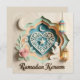 Esta tarjeta de felicitación es verdaderamente especial por su estética artesanal, que imita un hermoso diseño de recorte de papel multicapa. Los intrincados motivos del corazón y las flores, combinados con los suaves colores pastel, le dan un toque tierno y espiritual. Al incorporar la figura orante y las linternas, sirve como una forma altamente decorativa y significativa de desear a alguien "Ramadán Kareem".