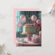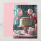 Una celebración temática de pasteles presenta una hermosa torta adornada con decoraciones rosas y blancas, rodeada de globos delicados y flores vibrantes, todo sobre un fondo suave y elegante.