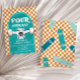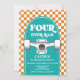 ¡Cuatro Rad De La Historia! Skateboard Let's Kick It, 4th Birthday guest con cheque naranja y patineta azul.