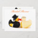 La novia y el novio patos de goma besándose. Sombrero superior y colas con tiara floral. Cuta invitación de boda o tarjeta que se puede personalizar con tu propio texto, nombres, fecha e imágenes.