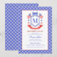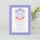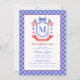 This patriotic bridal shower invitation features a watercolor crest with a light red white and blue patriotic crest with American flags and a blue bow. There is a blue and white border around the edge. You can personalize with your monogram.