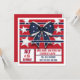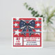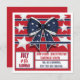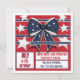 Divertida invitación de fiesta del 4 de julio roja, blanca y azul con un lazo azul marino adorable con estrellas blancas. El lazo está sentado entre rayas azules patrióticas y estrellas blancas contra un fondo rojo intenso. El reverso de esta invitación de fiesta personalizable tiene espacio adicional para información para sus invitados en el cumpleaños de América. ¡Disfruta tu fiesta!