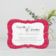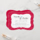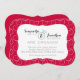 Esta invitación a la parte de compromiso presenta un fondo rojo con un patrón de giro blanco en la tarjeta con forma de soporte. Un gráfico de un anillo de diamantes está entre los nombres de la pareja comprometida. Una forma de corchete blanco en el centro incluye texto de personalizable para los detalles de las invitaciones. El color de fondo es el personalizable.