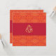 Invitaciones a la boda india con un patrón de batik rojo y naranja. Personaliza estas invitaciones de la boda india con tus propios detalles del día de la boda india. En la parte trasera de estas invitaciones rojas y naranjas a la boda india aparece Ganesha ग णे también escrito Ganesa y Ganesh, también conocido como Pillaiyar, Ganapati y Vinayaka es una de las deidades más conocidas y más adoradas. Señor de los inicios y Señor de los obstáculos.
