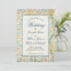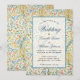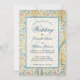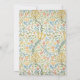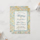 Esta invitación botánica tiene un patrón floral en el fondo y en la parte posterior. El texto está en un rectángulo blanco transparente. La ocasión "Boda" y los nombres están escritos en una elegante escritura caligráfica azul, el resto en pequeñas letras mayúsculas negras.