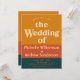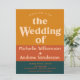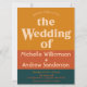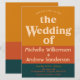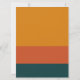Un diseño minimalista y audaz con tipografía retro de los setenta y bloques de color naranja y azul modernos cubren esta invitación de boda de gran tamaño