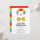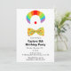 Celebre con estilo con estas brillantes invitaciones de fiesta de cumpleaños con temática de payasos de color arcoiris. Cuentan con un ilustracion de peluca de payaso arco iris, nariz de payaso roja y corbata de puntito polka amarillo. Estos suministros de fiesta están listos para ser personalizados con su propio texto.