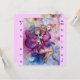 Colorido, caprichoso, divertido payaso rosa tocando la corneta con un búho expresivo y notas musicales alegres, flores, hojas en vibrantes colores rojo, fucsia, violeta, púrpura, azul, blanco, pintura en acuarela de Bulgan Lumini (c)