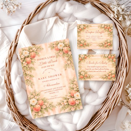 This romantic peach garden collection features soft watercolor peaches, blush florals, and delicate ribbon bows arranged in an elegant vintage-style frame. The warm pastel palette and airy botanical details create a timeless, feminine look that feels both sweet and refined. Perfect for a peach-themed celebration, this design pairs beautifully with garden, cottage, and storybook-inspired baby showers.