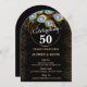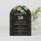 Elegante invitación al 50 aniversario de boda en negro y oro con anillo de oro y plumas de pavo real, cambia todo el texto usted mismo a cualquier aniversario o ocasión.