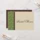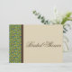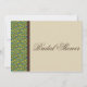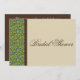 Elegante invitación a la ducha nupcial de diseño. Fondo crema y marrón, y diseño de plumas de pavo real en un lado.